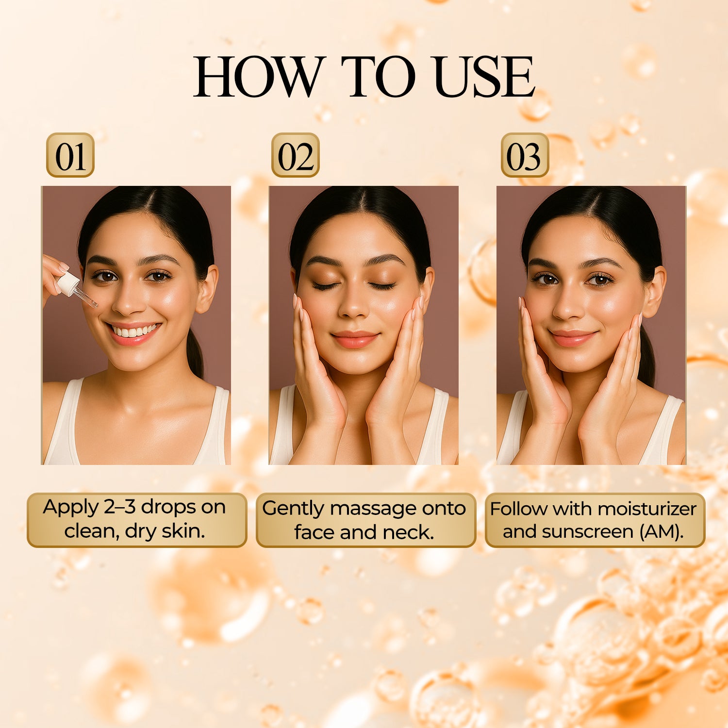 Apply 2-3 drops to cleansed face and neck every morning and evening. Gently pat until fully absorbed. Follow with moisturizer for intensified benefits.